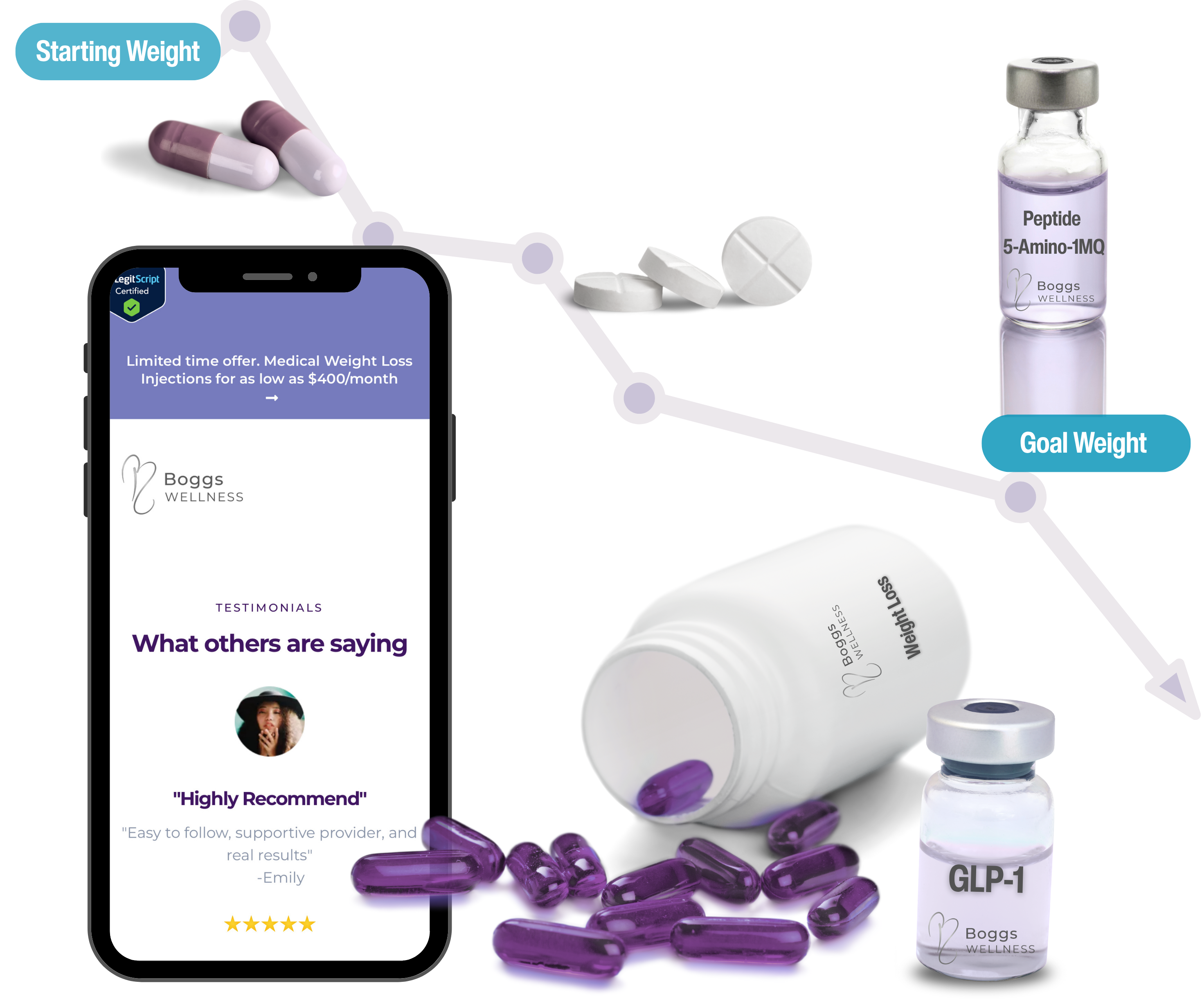 Prescription products require an online consultation with a licensed healthcare provider who will determine if a prescription is medically appropriate. This service is not available in all 50 states. All medications, including compounded treatments, are prescribed based on medical evaluation and clinical judgment. Boggs Wellness does not guarantee specific outcomes. Discontinuing treatment may result in weight regain.Individual results may vary. See website for full details and important safety information.